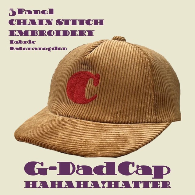 ★★HAHAHA!HATTER★★ ★Model : G-DadCap HAHAHA!HATTERの定番キャップモデルG-DadCap。古いベースボールキャップをベースに型をおこしました。現行のベースボールキャップでは珍しい幅が広いツバがポイント。後ろはアジャスターが無くスッキリしたバックスタイル。内側にフリーサイズアジャスターを使っているので、散髪で多少ボリュームがなくなってもサイズを縮める事ができます。お爺さんがジャケットにかぶっているキャップをイメージしたこのモデル。フォントは私が好きなスタウトビール会社のフォントをオマージュ。チェーンステッチで刺繍してもらっています。 ★生地 英国生地、Batemanogden 8Wcorduroy ★刺繍 チェーンステッチ / オレンジ色 / C / ※今回は英国のケンブリッジ大学にちなんで( C )を選びました。 ★サイズ 〜58cm(内側フリーアジャスター) ※こちらの商品は1点物です。 ※生地、刺繍、サイズなど全てオーダーメイドもできます。お気軽にお問い合わせください。 ※ツバは曲がってはいますが、よりツバ曲げ希望の方は備考欄に記入お願い致します。